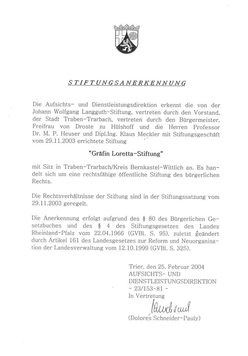 Gräfin Loretta-Stiftung mit Sitz in Traben-Trarbach verfolgt